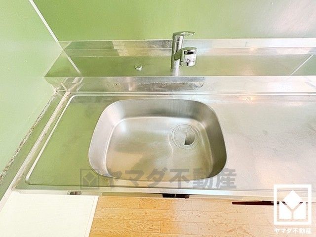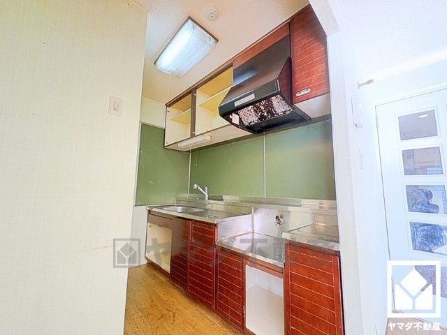 キッチンは空間を有効活用できる壁付けタイプ。都市ガス対応です。プロパンガスと比べて料金がやすいため、日々のランニングコストを抑えることができます。