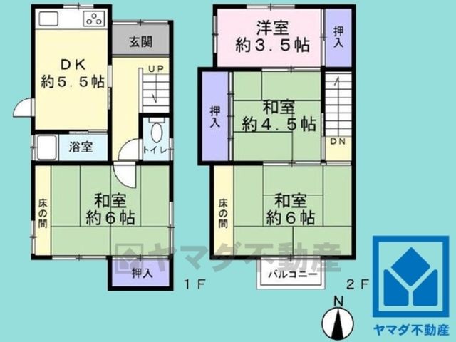 DK5.5畳(1F)、和6畳(1F)、和6畳(2F)、和4.5畳(2F)、洋3.5畳(2F) |