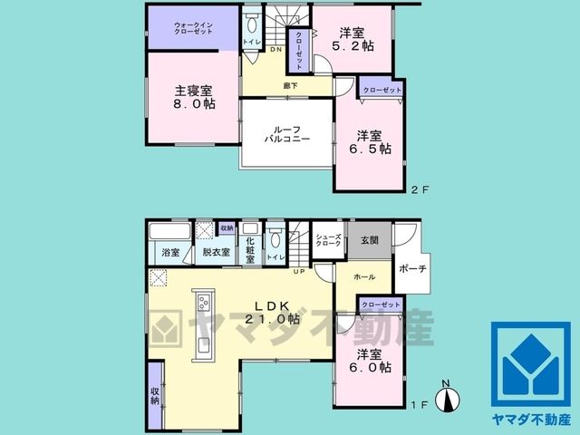 LDK21畳(1F)、洋6畳(1F)、洋8畳(2F)、洋6.5畳(2F)、洋5.2畳(2F) |