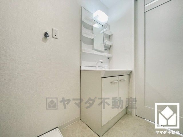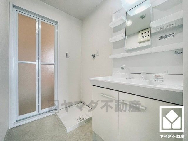 収納付きでスッキリお使い頂ける洗面台です。洗面ボウルが広めなので、忙しい朝でも身支度がしやすく時短になります。