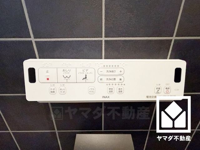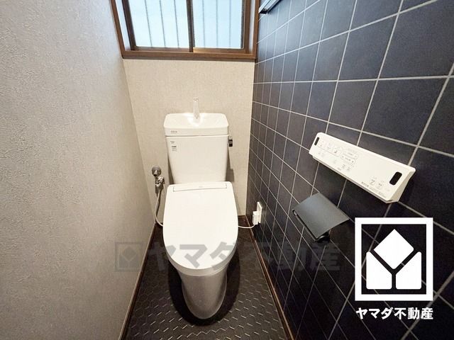 上品な壁紙と遊び心のあるタイルデザインが魅力的なトイレ空間。機能性とセンスが融合した、居心地の良いプライベートスペースです。