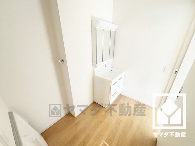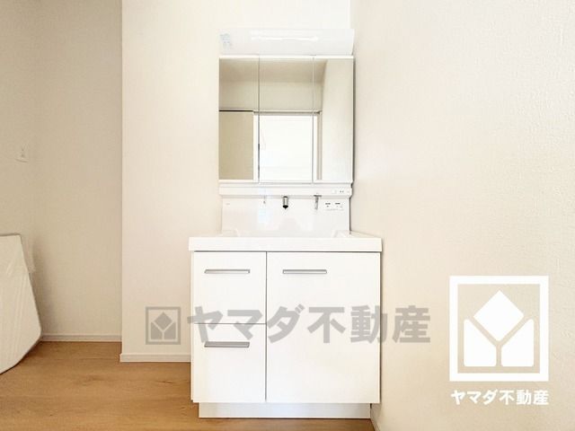 収納付きでスッキリお使い頂ける3面鏡の洗面台です。洗面ボウルが広めなので、忙しい朝でも身支度がしやすく時短になります。