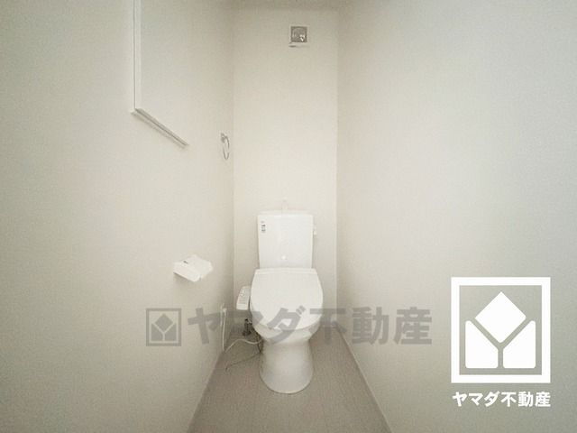 明るく清潔感溢れるトイレです。タオル掛けやペーパーホルダーが設置されています。