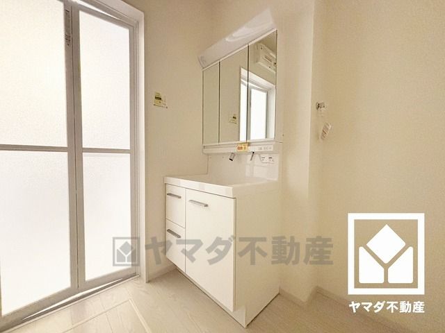 収納付きでスッキリお使い頂ける3面鏡の洗面台です。洗面ボウルが広めなので、忙しい朝でも身支度がしやすく時短になります。