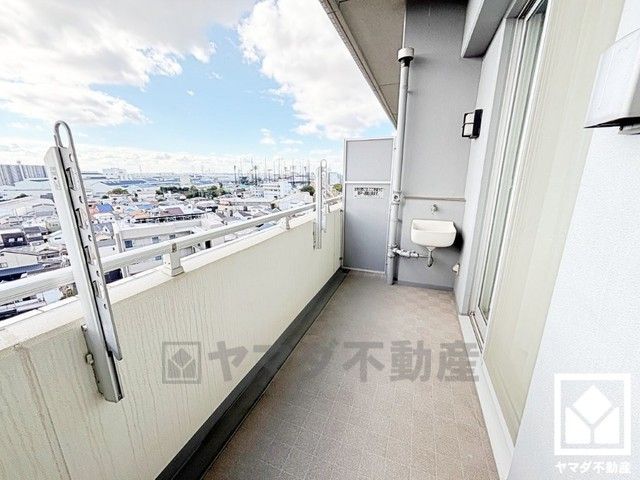 南向きバルコニーで陽当たり、風通し良好。11階建て9階部分で前面に視界を遮る高い建物がなく、開放的な景色が広がります。奥行きがあり広々としているため、お洗濯物もたっぷりと干す事ができます。