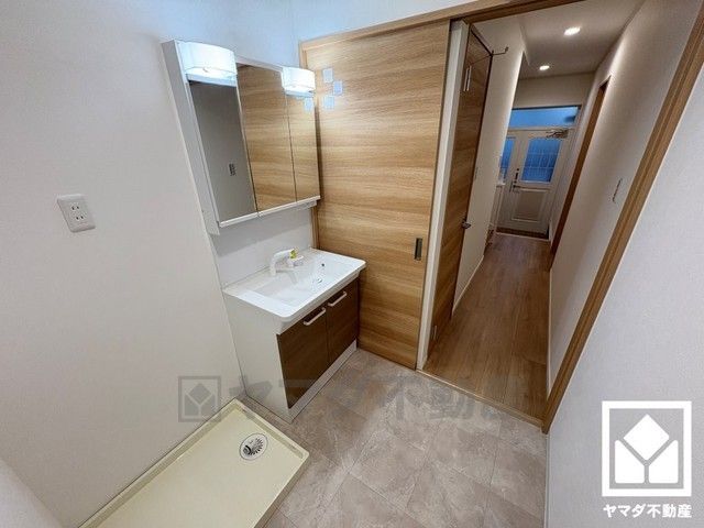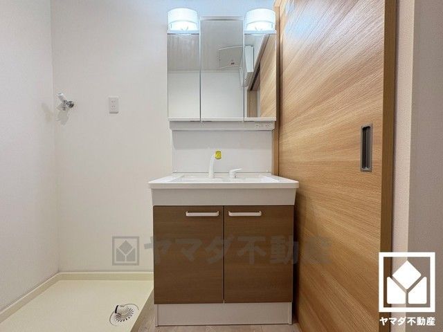 収納付きでスッキリお使い頂ける3面鏡の洗面台です。洗面ボウルが広めなので、忙しい朝でも身支度がしやすく時短になります。