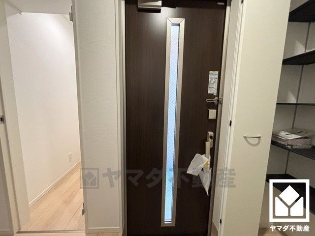 ドアのスリット窓から光が差し込み、外出時にも帰宅時にも、明るい気持ちになれる玄関です。人感センサー付き玄関灯が設置されています。
