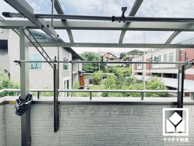 南東向きバルコニーで陽当たり、風通し良好。広々としているため、お洗濯物をたっぷりと干す事ができます。屋根付きなので急な雨の日も安心ですね。