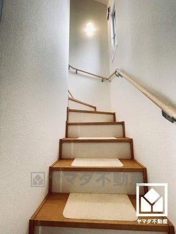 階段には手摺りがございます。バリアフリーにも配慮された、家族みんなが過ごしやすい住宅です。