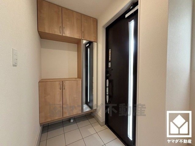 玄関にはシューズボックスを完備。家族の靴もしっかり収納できるので、玄関がいつも片付き、気持ちよくお客様を迎えられます。お出かけの前のチェックにも便利な鏡付きです。