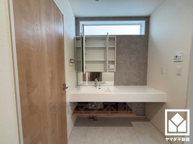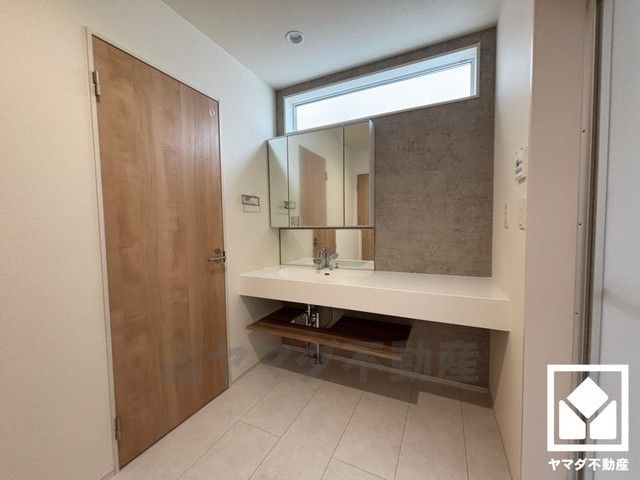 小窓付きで明るいサニタリースペース。ワイドなフルフラットカウンター付きの3面鏡の洗面台で、忙しい朝でも身支度がしやすく時短になります。お手入れもラクラクです。