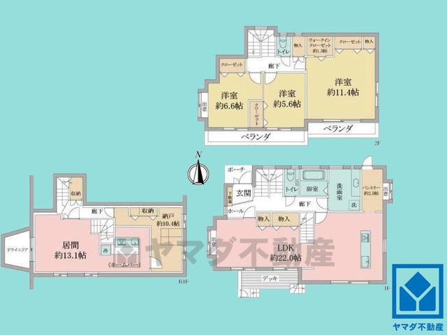 LDK13.1畳、その他10.4畳、LDK22畳(1F)、洋11.4畳(2F)、洋6.6畳(2F)、洋5.6畳(2F) |