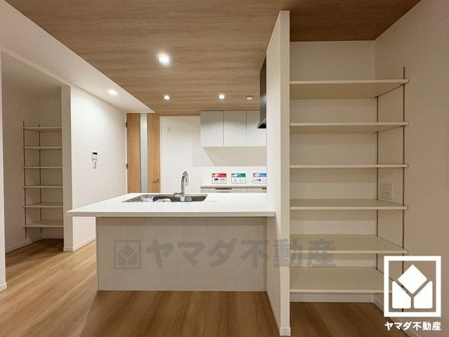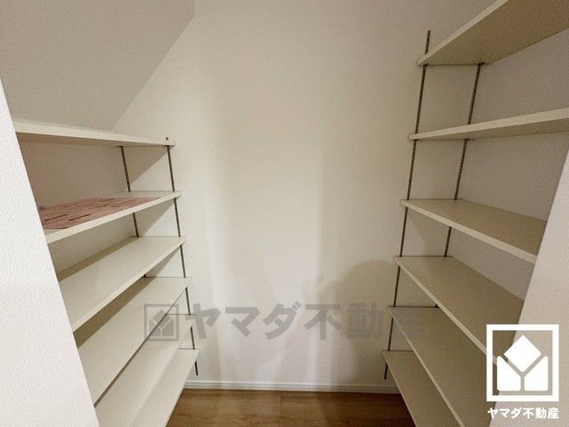 キッチン横にはパントリーがございます。まとめ買いしても心配要らずの収納力です。食品のストックや食器等もすっきり片付けることができます。