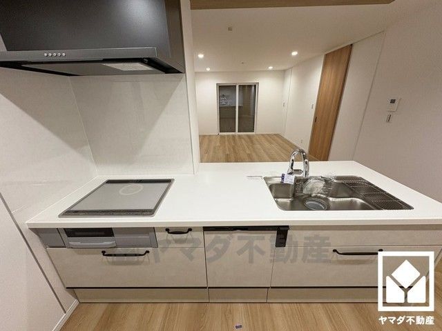 明るい白色で統一された清潔感のあるデザインが魅力のシステムキッチンです。統一されたデザインのカップボード付きで、スッキリとした空間が保てます。