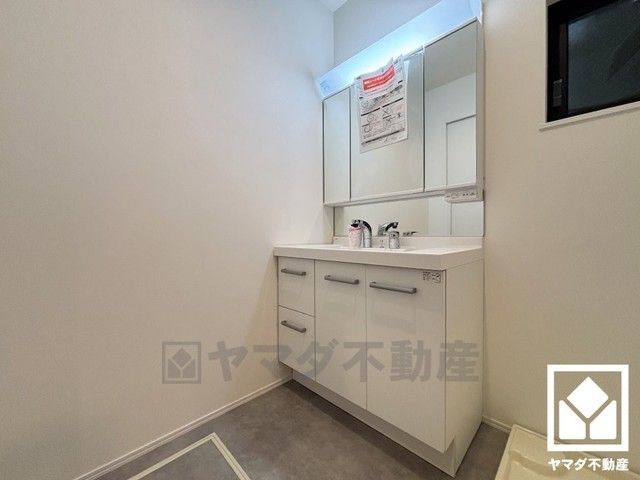 収納付きでスッキリお使い頂ける3面鏡の洗面台です。洗面ボウルが広めなので、忙しい朝でも身支度がしやすく時短になります。