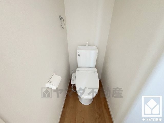 明るく清潔感溢れる2階トイレです。タオル掛けやペーパーホルダーが設置されています。