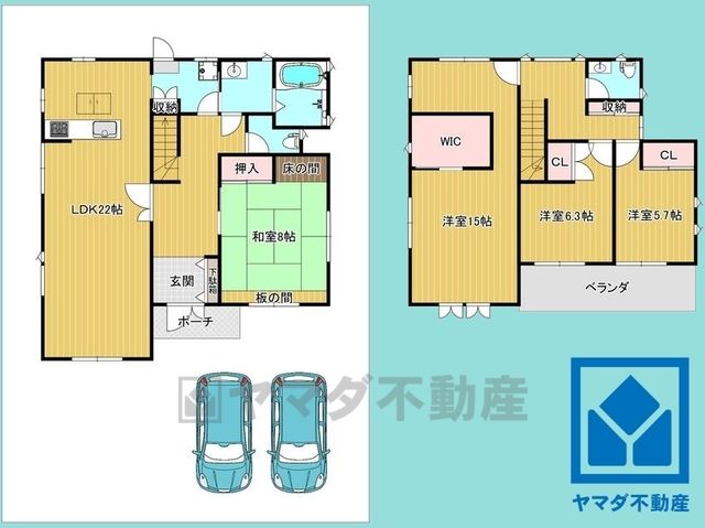 LDK22畳(1F)、和8畳(1F)、洋15畳(2F)、洋6.3畳(2F)、洋5.7畳(2F) |