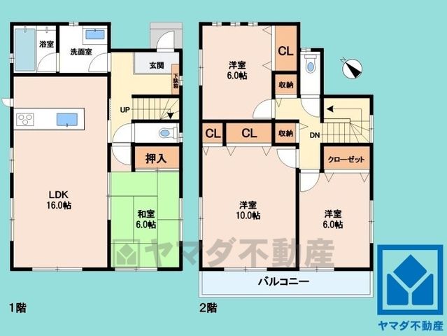 LDK16畳(1F)、和6畳(1F)、洋10畳(2F)、洋6畳(2F) |
