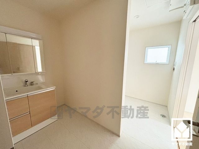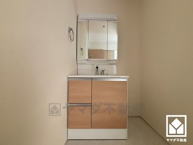 収納付きでスッキリお使い頂ける3面鏡の洗面台です。洗面ボウルが広めなので、忙しい朝でも身支度がしやすく時短になります。