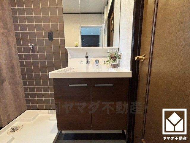 収納付きでスッキリお使い頂ける3面鏡の洗面台です。洗面ボウルが広めなので、忙しい朝でも身支度がしやすく時短になります。