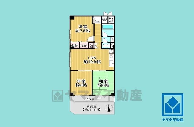 南向きバルコニーで陽当たり、風通し良好。約23.19平米の専用庭があり、ガーデニングなどもお楽しみいただけます。広々としているため、お洗濯物もたっぷりと干す事ができます。