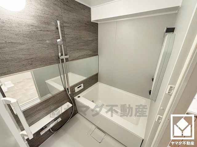 1日の疲れを癒す浴室でゆったりリフレッシュ。ナチュラルな木目調のアクセントパネルは落ち着いた雰囲気を演出してくれます。鏡が横長なので、お子様でも見やすく便利です。