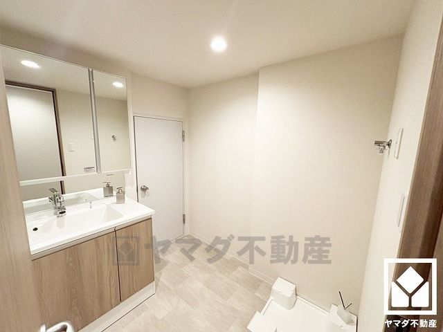 収納付きでスッキリお使い頂ける3面鏡の洗面台です。洗面ボウルが広めなので、忙しい朝でも身支度がしやすく時短になります。
