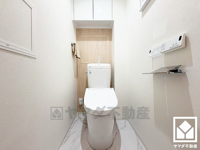 明るく清潔感溢れるトイレです。トイレットペーパーのストックや消耗品置き場などとしてお使いいただける吊戸棚がございます。