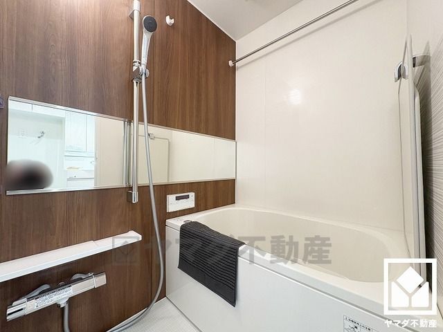 1日の疲れを癒す浴室でゆったりリフレッシュ。ナチュラルな木目調のアクセントパネルは落ち着いた雰囲気を演出してくれます。鏡が横長なので、お子様でも見やすく便利です。