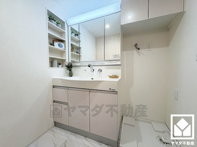 収納付きでスッキリお使い頂ける3面鏡の洗面台です。洗面ボウルが広めなので、忙しい朝でも身支度がしやすく時短になります。