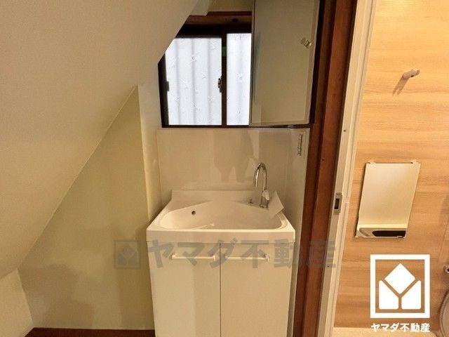 窓から柔らかな光が差し込む明るい洗面台です。吊戸棚も設置されており、スッキリお使い頂けます。