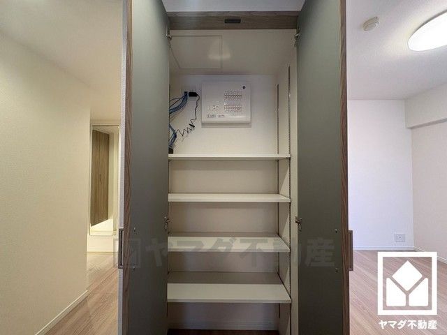 廊下にも収納スペースがあり、住空間を広々お使いいただけます。内部は可動棚になっておりますので、用途に合わせて高さを調整できます。