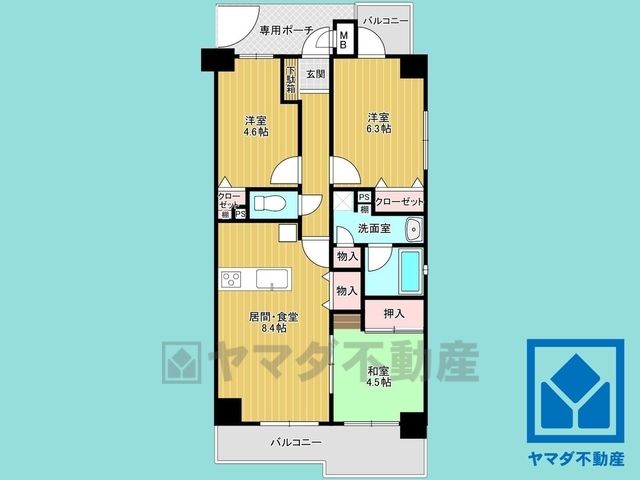DK8.4畳、洋6.3畳、洋4.6畳、和4.5畳 |