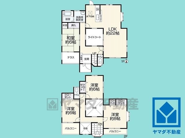 LDK22畳(1F)、和6畳(1F)、洋8畳(2F)、洋6畳(2F) |