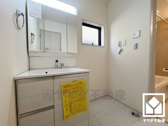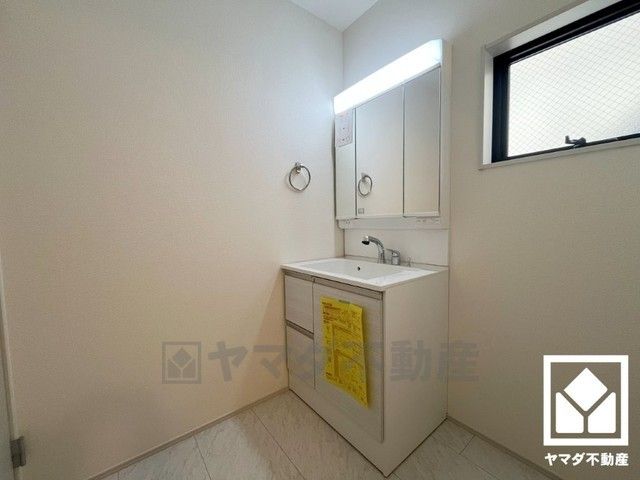 収納付きでスッキリお使い頂ける3面鏡の洗面台です。洗面ボウルが広めなので、忙しい朝でも身支度がしやすく時短になります。