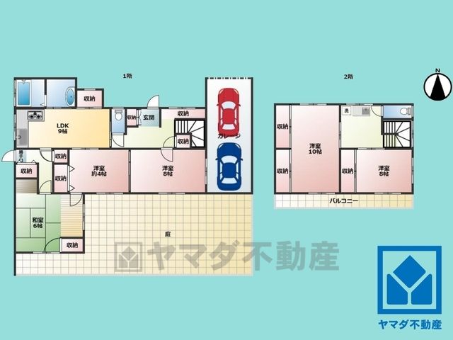 LDK9畳(1F)、洋8畳(1F)、洋4畳(1F)、和6畳(1F)、洋10畳(2F)、洋8畳(2F) |