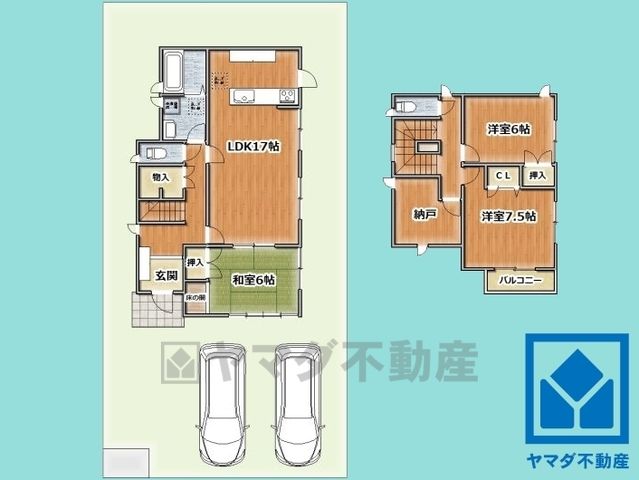 LDK17畳(1F)、和6畳(1F)、洋7.5畳(2F)、洋6畳(2F)、その他0畳(2F) |