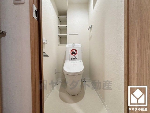 明るく清潔感溢れるトイレです。トイレットペーパーのストックや消耗品置き場、小物置きなどとしてもお使いいただける棚が複数ございます。