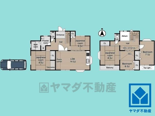 LDK14畳(1F)、和8畳(1F)、和6畳(1F)、和8畳(2F)、洋7.5畳(2F)、洋6畳(2F) |