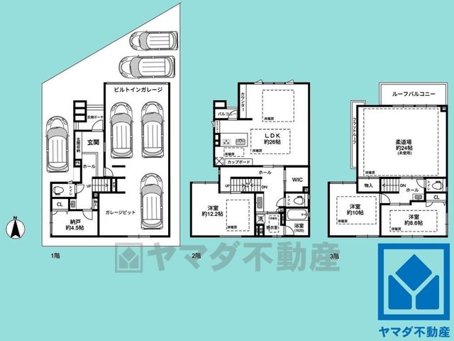 その他4.5畳(1F)、LDK26畳(2F)、洋12.2畳(2F)、その他24畳(3F)、洋10畳(3F)、洋8.6畳(3F) |