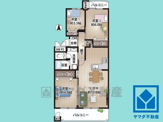 南北両面バルコニーで陽当たり、風通し良好。バルコニーが2か所ございますので、お洗濯物をたっぷりと干す事ができます。