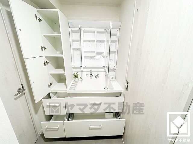 収納豊富なトールキャビネット付きでスッキリお使い頂ける3面鏡の洗面台です。洗面ボウルが広めなので、忙しい朝でも身支度がしやすく時短になります。