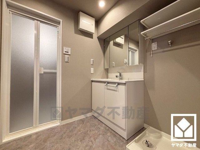 収納付きでスッキリお使い頂ける3面鏡の洗面台です。洗面ボウルが広めなので、忙しい朝でも身支度がしやすく時短になります。