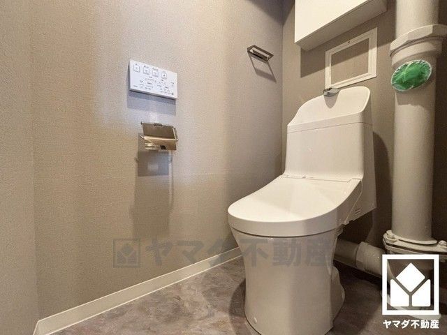明るく清潔感溢れるトイレです。トイレットペーパーのストックや消耗品置き場などとしてお使いいただける吊戸棚がございます。