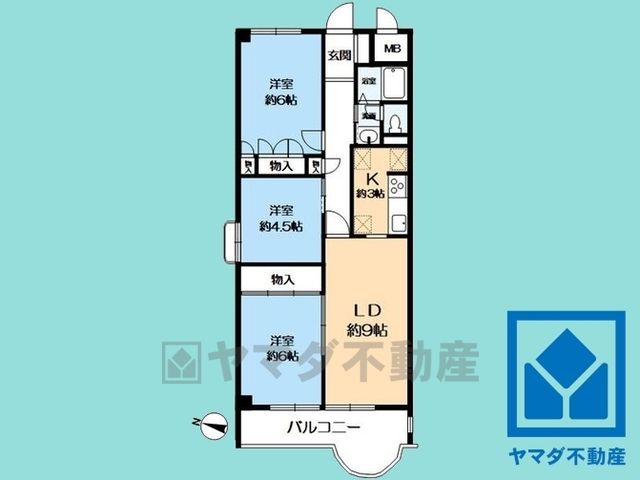 LD9畳、K3畳、洋6畳、洋4.5畳 |
