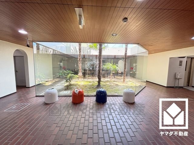 ガラス越しに坪庭の見えるロビーが、心地よい開放感を演出。落ち着いた空間で、ほっと一息つける時間を。